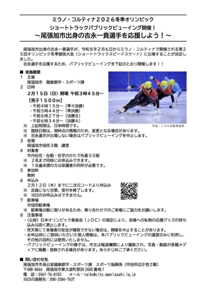 14Feb2026 パブリックビューイング開催! ミラノ・コルティナ2026冬季オリンピックショートトラックパブリックビューイング開催! ~尾張旭市出身の吉永一貴選手を応援しよう!~ パブリックビューイングを開催します。 朝早いですが、熱い応援を Tweet Share Hatena Pocket RSS feedly Pin it 国立印刷局静岡工場 第2回本地ヶ原桜まつりを開催 最近の活動報告一覧活動報告一覧 あゆネット結成20周年記念講演 2026.03.02 363防犯パトロール(2026年2月) 2026.02.28 晴丘センター『新エネ大賞受賞』 2026.02.21 スイっとあさぴーに決定 2026.02.20 第2回本地ヶ原桜まつりを開催 2026.02.19