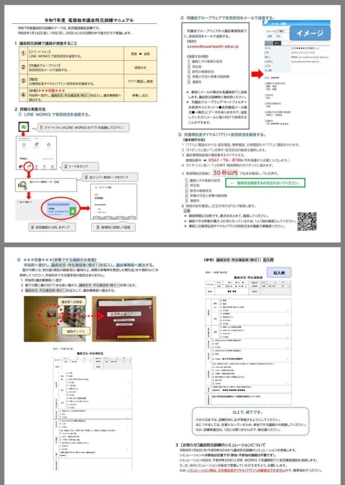 21Jan2026 尾張旭市議会防災訓練(2026年1月20日) 議会防災訓練が開催されました。 1月16日(金)、19日(月)、20日(火)の3日間の内抜き打ちで地震が発生する想定です。LINEワークスで連絡が届き、安否確認の返信、災害ダイヤルへの登録、登庁などが訓練内容です。 今回は19日と20日に2回の訓練がありました。 (2026年1月20日議会事務局にて) Tweet Share Hatena Pocket RSS feedly Pin it ジョギング大会全体打ち合わせ 令和8年度新春懇談会 最近の活動報告一覧活動報告一覧 あゆネット結成20周年記念講演 2026.03.02 363防犯パトロール(2026年2月) 2026.02.28 晴丘センター『新エネ大賞受賞』 2026.02.21 スイっとあさぴーに決定 2026.02.20 第2回本地ヶ原桜まつりを開催 2026.02.19