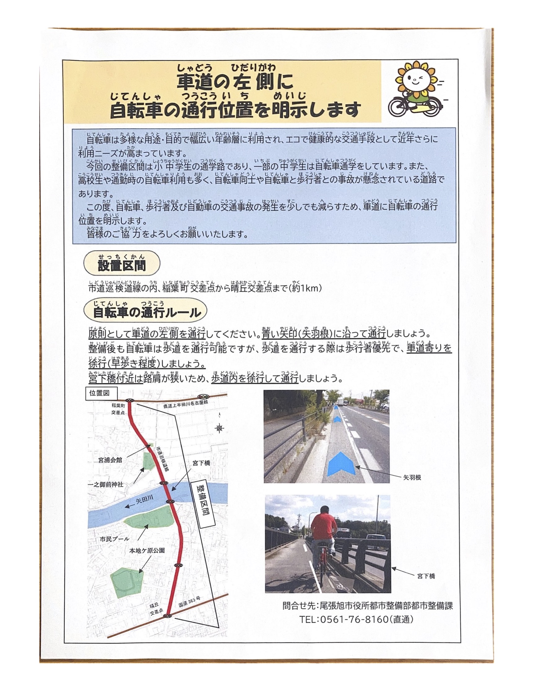 14Jan2023 自転車道の整備について 市道巡検道線の晴丘交差点から稲葉町交差点までの 区間に自転車道が整備されます。 自転車通学の生徒たちの安全を確保していきます。 自転車の通行ルールはしっかり守りましょう。 Tweet Share Hatena Pocket RSS feedly Pin it 後援会事務所開所式に出席 愛知駅伝大会開催 最近の活動報告一覧活動報告一覧 あゆネット結成20周年記念講演 2026.03.02 363防犯パトロール(2026年2月) 2026.02.28 晴丘センター『新エネ大賞受賞』 2026.02.21 スイっとあさぴーに決定 2026.02.20 第2回本地ヶ原桜まつりを開催 2026.02.19