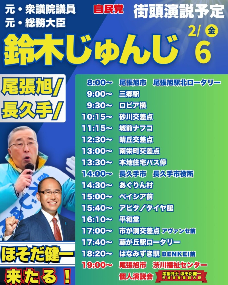 06Feb2026 2月6日、今朝は尾張旭駅からスタート 今朝は尾張旭駅からスタートです。 鈴木じゅんじさん候補と街頭してます。 19時からは渋川福祉センターの予定です。 Tweet Share Hatena Pocket RSS feedly Pin it 総決起大会 鈴木じゅんじ個人演説会 最近の活動報告一覧活動報告一覧 あゆネット結成20周年記念講演 2026.03.02 363防犯パトロール(2026年2月) 2026.02.28 晴丘センター『新エネ大賞受賞』 2026.02.21 スイっとあさぴーに決定 2026.02.20 第2回本地ヶ原桜まつりを開催 2026.02.19